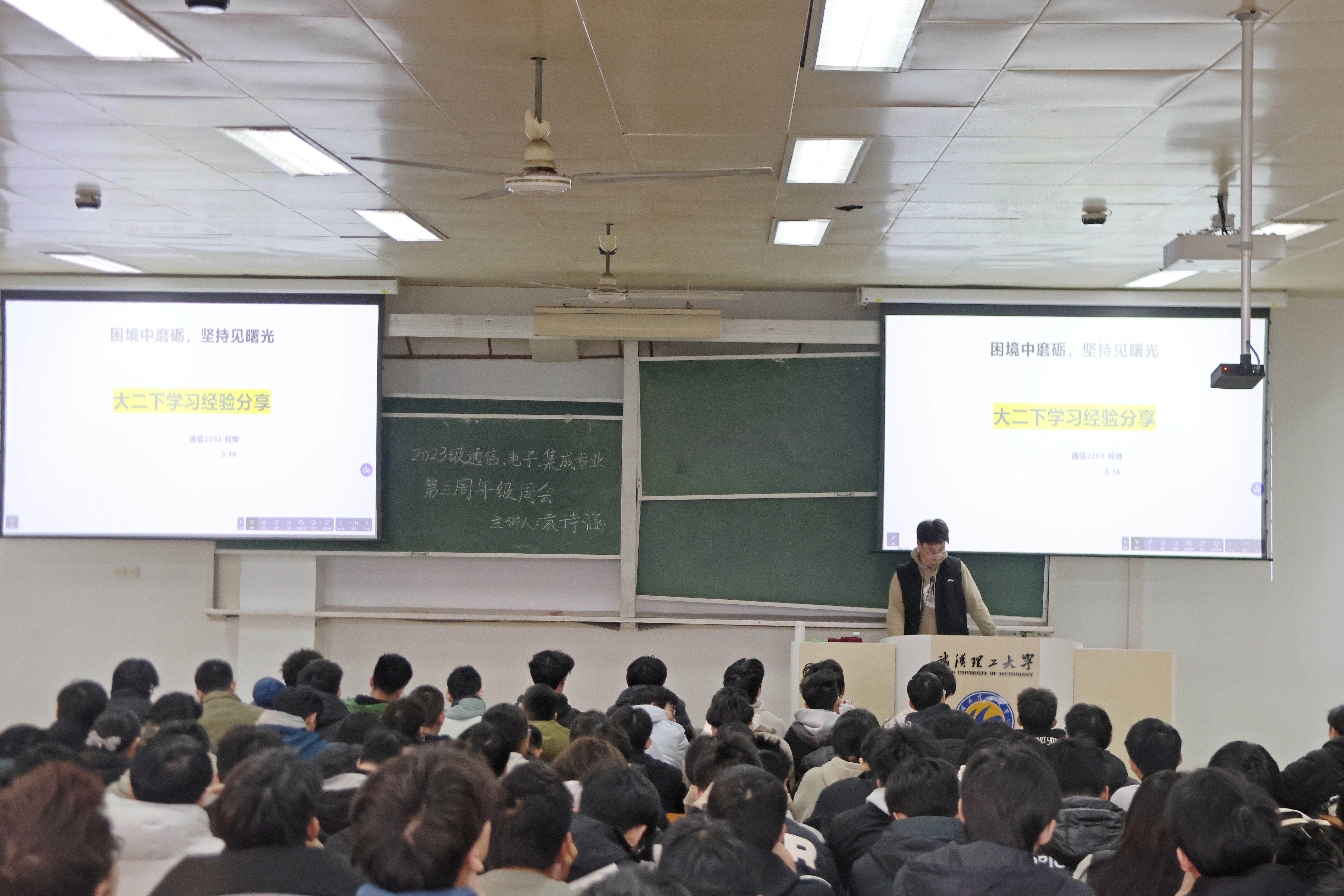 面向2023级本科生举办了以“笃学力行·朋辈引航”为主题的学习经验分享会。本次活动邀请到通信2203的何烨同学担任主讲嘉宾,他以“困境中磨砺,坚持见曙光”为主题,通过经验分享与互动交流,分享大二专业核心课程学习的经验。